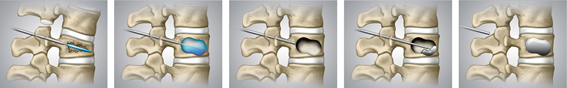 骨粗鬆症を伴う脊椎圧迫骨折に対して行われる低侵襲手術の一方法です。この手術手技が適応となるためには幾つかの条件があり、基本的に骨折した椎体の後壁が損傷されていないもの、骨癒合していないものに実施されます。手術は全身麻酔下に背中に約5mmの切開を2ヶ所加えて、細い針を骨折椎体に挿入します。その針を介して風船(Balloon)を骨折椎体内に設置し、膨らますことでゆっくりと潰れた骨を整復します。風船除去後に生じたスペースに骨セメント(PMMA)を注入して、骨折部を固めます。原則、手術翌日より起立・歩行を開始します。入院期間は最短で約7日程度です。