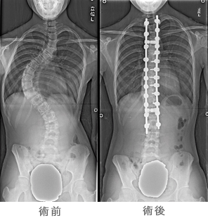 側弯症の大部分は学童期の後半から思春期に発生します。側弯症では脊柱が横(側方)に曲がり、進行すると変形による心理的ストレスの原因や腰痛や背部痛、肺活量の低下などの呼吸機能障害、まれに神経障害を伴うことがあります。手術は曲がった脊柱を矯正固定する方法が行われます。背中から行う方法(後方法)と体の横から行う方法(前方法)があり、患者さんの年齢、側弯の部位、大きさ、タイプなどを考えて、いずれかあるいは両者が行われます。和歌山県立医科大学整形外科では、手術に伴う神経麻痺を防ぐための脊髄機能モニタリングや自己血輸血を導入することで手術の安全性を高めています。手術方法により異なりますが、概ね1週以内に装具を装着することなく歩行ができ、2−3週以内で退院可能となります。脊柱側弯症についてさらなる詳しい知識を望まれるかたは日本側彎症学会ホームページもご参照下さい。